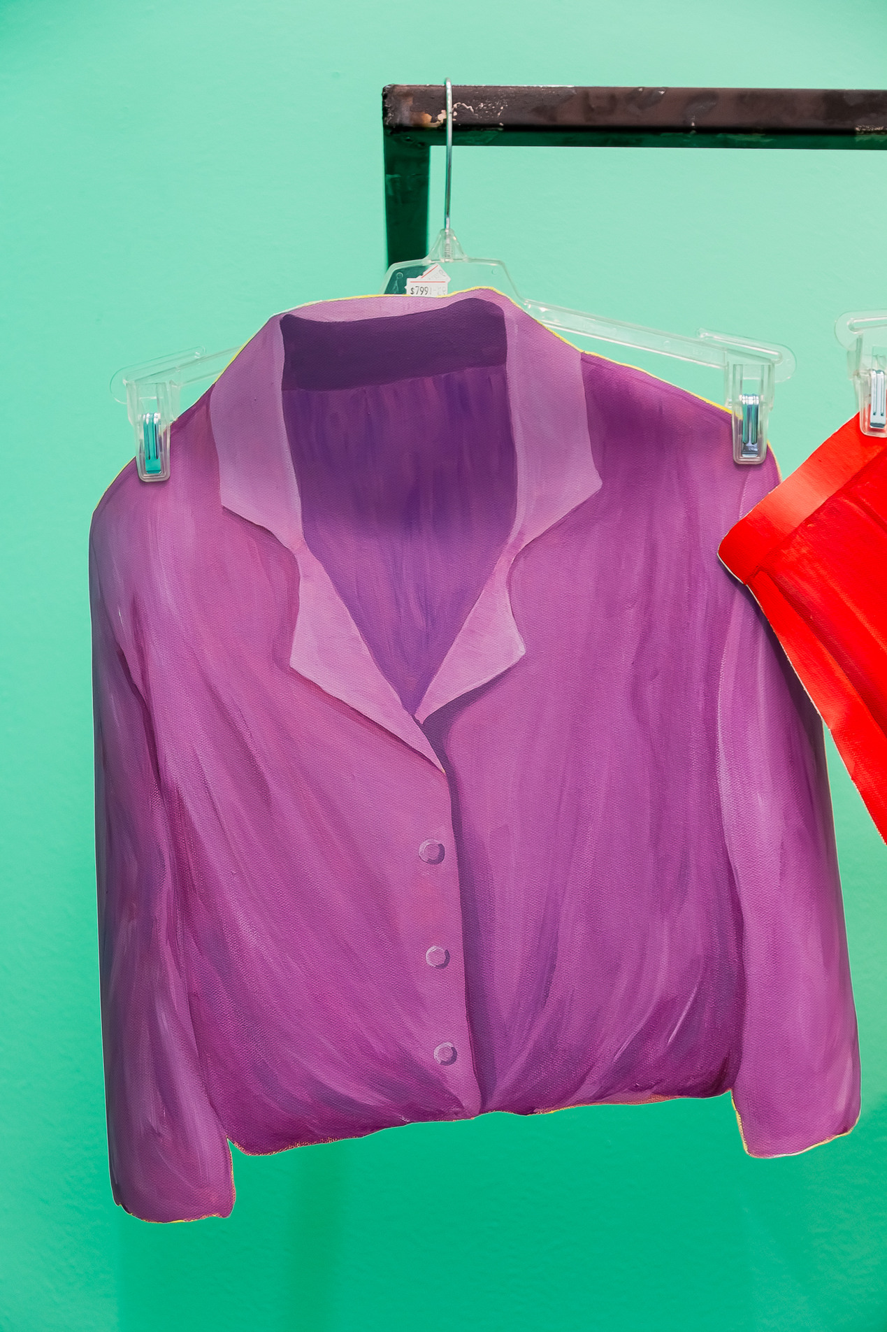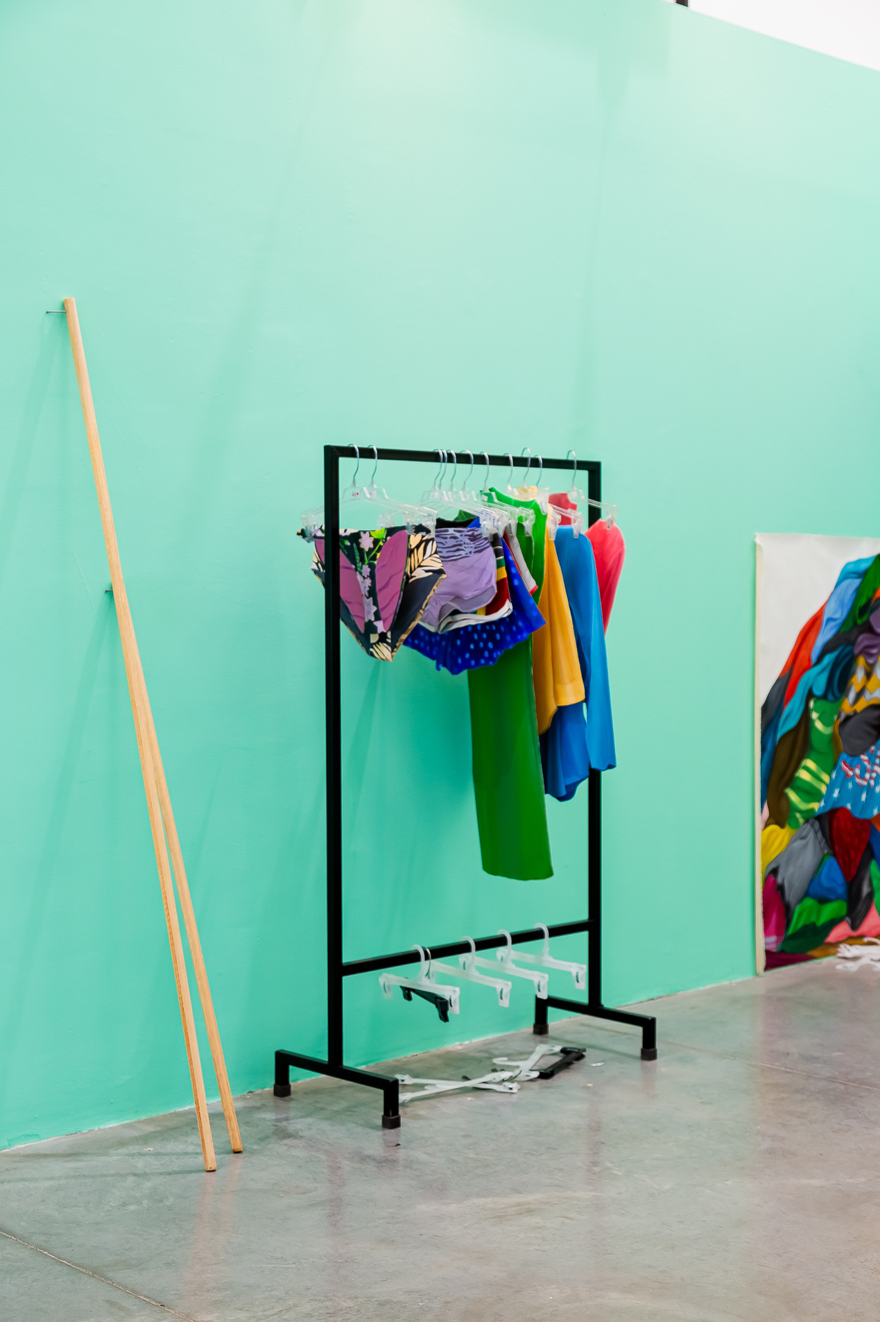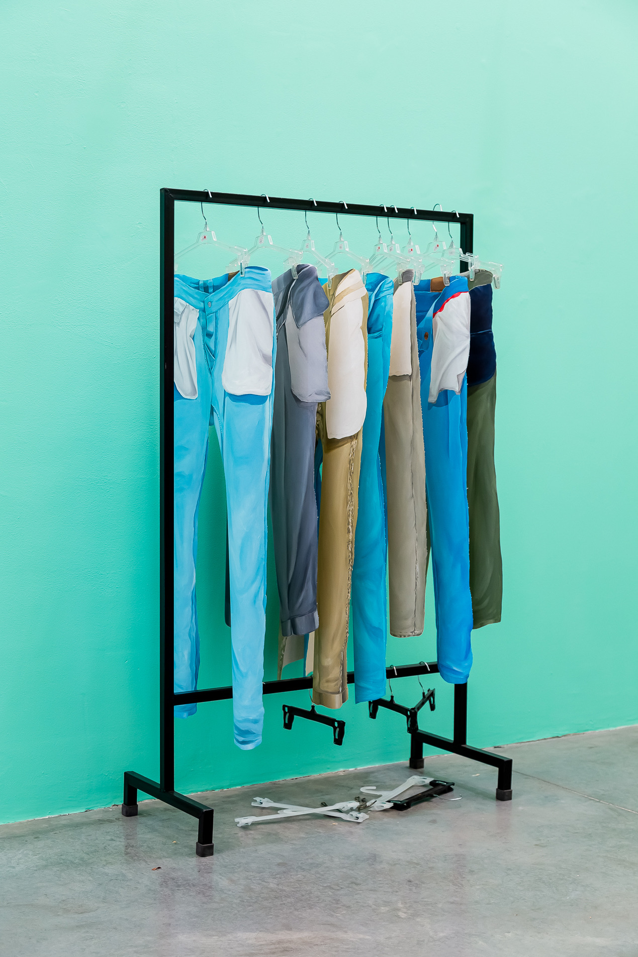 Para esta exposición, el artista recrea una “paca” de Mixco en la galería, con la sorpresa de que cada prenda es una pintura acrílica a escala real sobre lienzo. Hay colchas, toallas, pantalones, edredones, camisas, faldas, vestidos y blusas. Hay piezas nuevas y con estilo y otras absurdas que reflejan los tesoros únicos de estos negocios. La idea de trasladar literalmente el fardo y no abstraerlo al cubo blanco, lo libera de ser una apropiación “gentrificada”, y es más bien un intento del artista por compartir la vida cotidiana de su familia y su comunidad a través de su lenguaje pictórico.