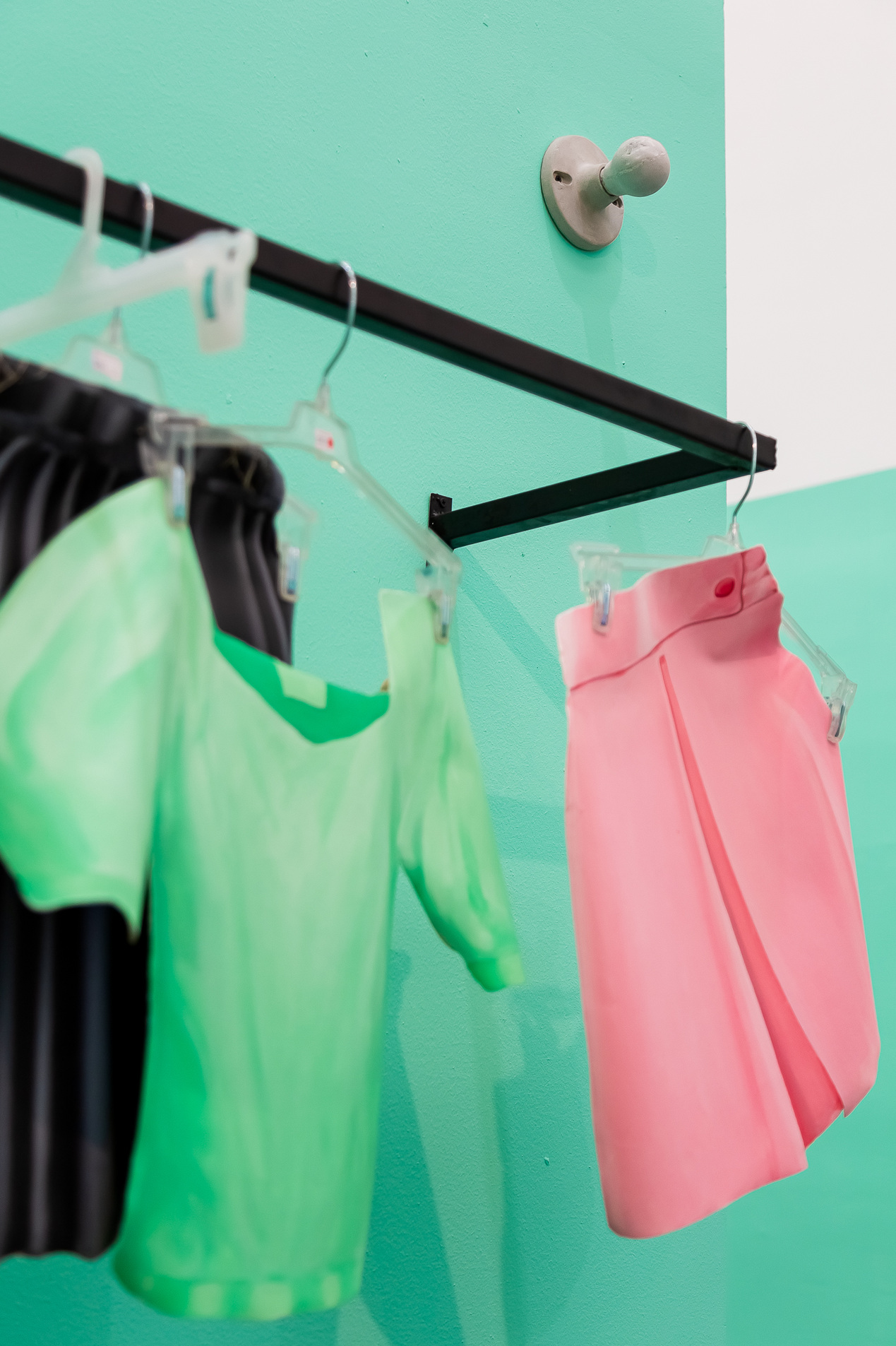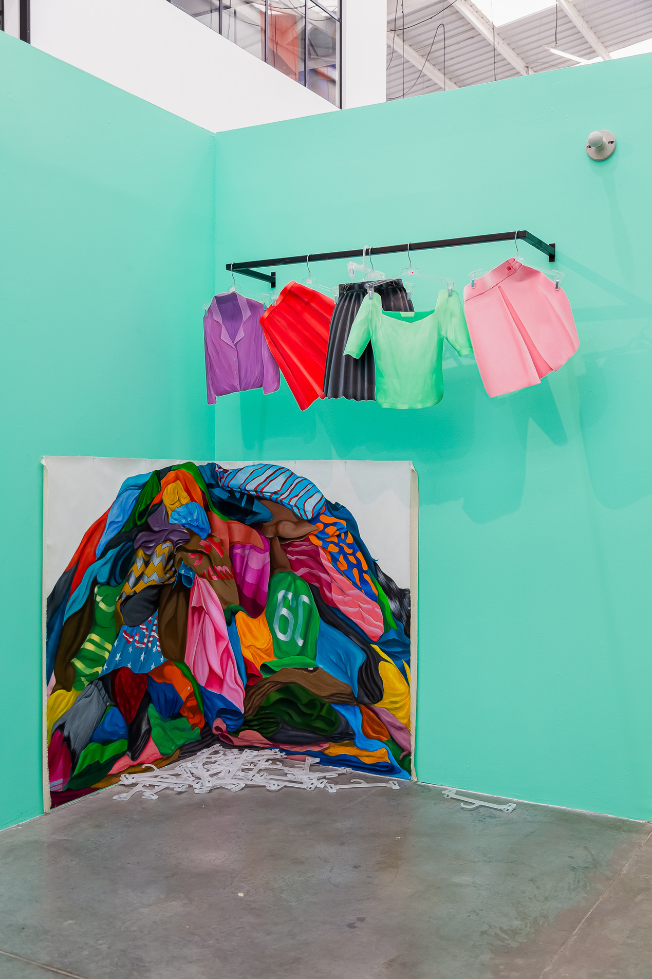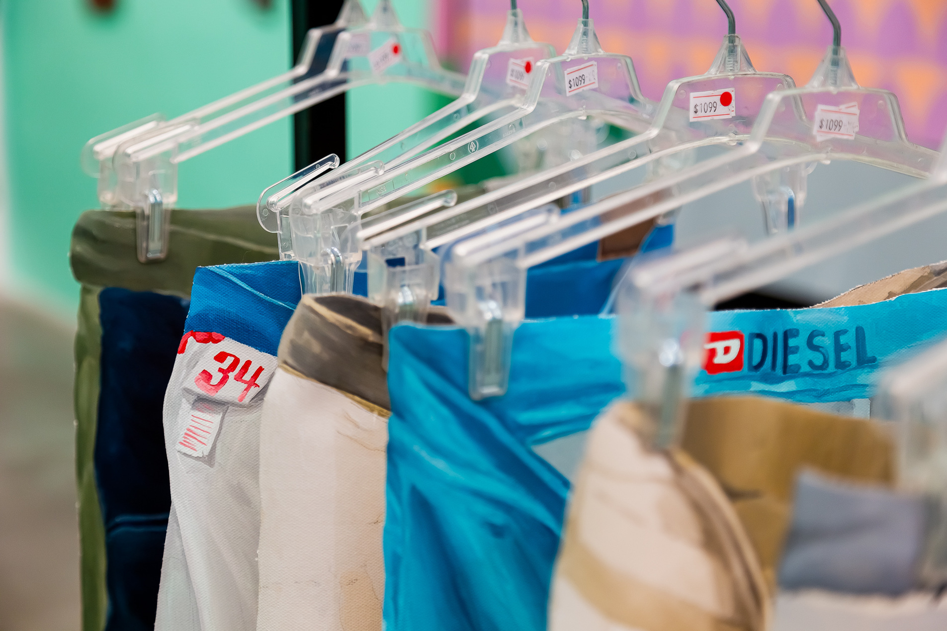 Para esta exposición, el artista recrea una “paca” de Mixco en la galería, con la sorpresa de que cada prenda es una pintura acrílica a escala real sobre lienzo. Hay colchas, toallas, pantalones, edredones, camisas, faldas, vestidos y blusas. Hay piezas nuevas y con estilo y otras absurdas que reflejan los tesoros únicos de estos negocios. La idea de trasladar literalmente el fardo y no abstraerlo al cubo blanco, lo libera de ser una apropiación “gentrificada”, y es más bien un intento del artista por compartir la vida cotidiana de su familia y su comunidad a través de su lenguaje pictórico.